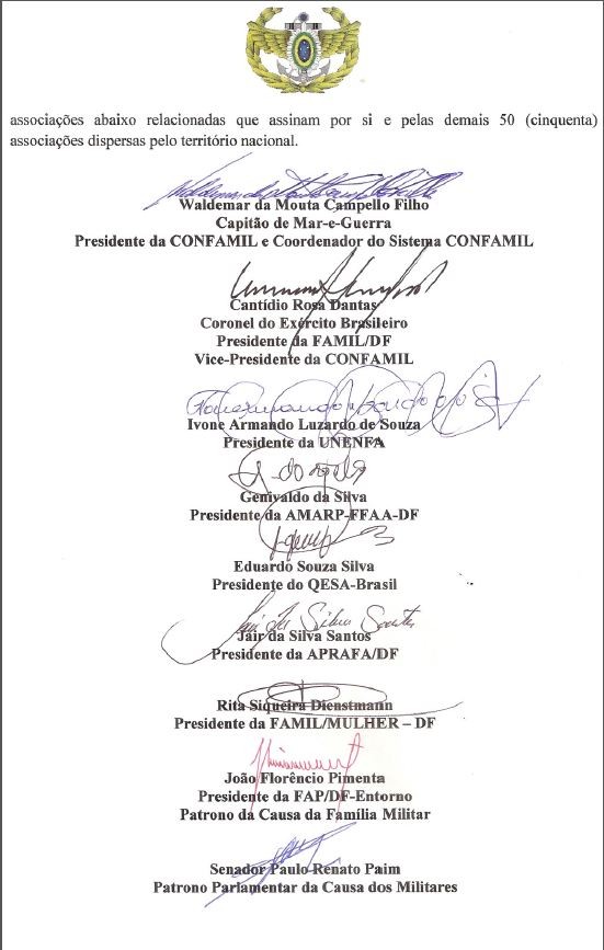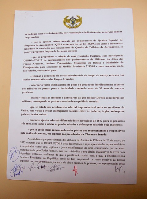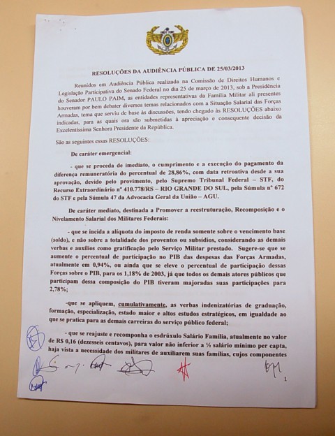 Hoje, 02 Abr. 2013, foi entregue ao Senador Paulo Paim o documento gerado pelo Grupo de Trabalho fruto da Audiência Pública realizada no último dia 25 Mar. 2013 na Comissão de Direitos Humanos do Senado Federal, estiveram presentes os representante da Associação de Praças das Forças Armadas (APRAFA), Jair da Silva Santos e Elmalan Nael; e os presidentes da Federação da Família Militar do DF (FAMIL), Cantidio Rosa Dantas; Drº João Pimenta da Associação dos Aposentados, Pensionistas e Idosos da Previdência Social (ASAPREV), da Comissão Nacional QESA Brasil (CNQB), Eduardo Souza Silva; da Associação dos Militares da Reserva, Reformados e Pensionistas das Forças Armadas (AMARP), Genivaldo da Silva; da União Nacional de Esposas de Militares das Forças Armadas (UNEMFA), Ivone Luzardo; da Federação da Família Militar - Mulher/DF (FAMIL Mulher), Rita Deinstmann; e da Confederação Nacional da Família Militar (CONFAMIL), Waldemar da Mouta Campello, a Drª Mirian Deinstmann do PAI do Brasil Mulher e o companheiro de lutas da Causa QESA Henrique Oliveira.
